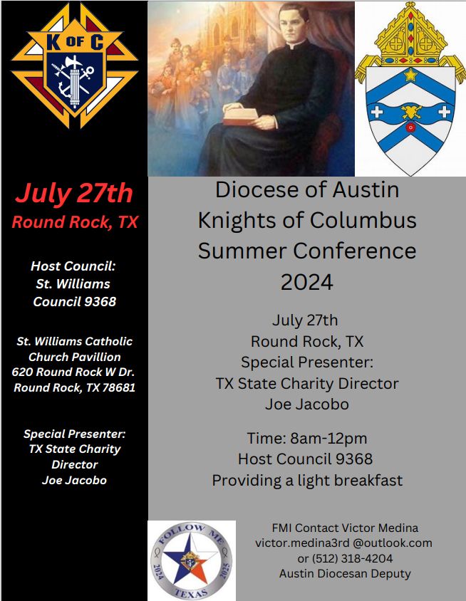 Good evening and Greetings from our Supreme Knight Patrick Kelly, our State Deputy Ron Alonzo, and the Great Diocese of Austin. I would like to remind all and extend an official invitation to all to come out and attend the Diocesan Summer Conference on Saturday, July 27th. Guest speaker is our Texas State Charity Director Joe Jacobo. Event will start at 8:00 and go through 12 pm. Council 9368 will be providing breakfast tacos!! Come out and socialize and see what changes are coming with the new fraternal year.