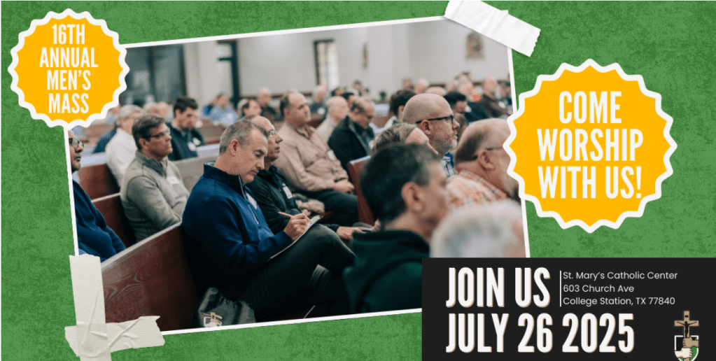 The Central Texas Fellowship of Catholic Men (CTFCM) Men’s Mass is coming up on July 26, 2025 at St. Mary’s Catholic Center in College Station.